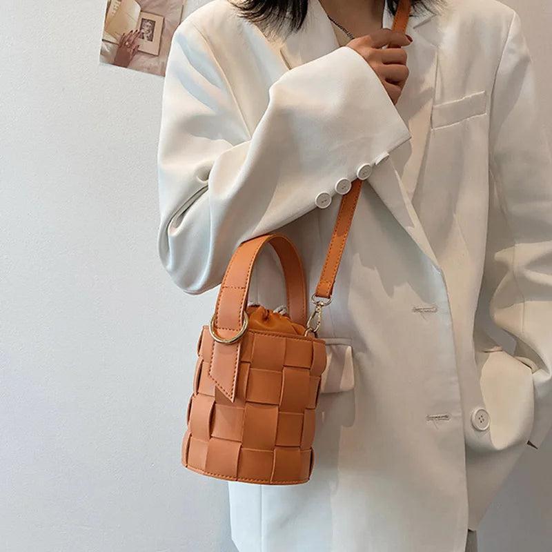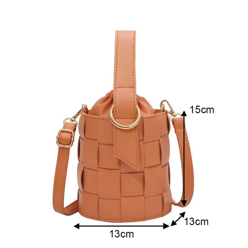Stay stylish and organized with this woven bucket bag perfect for summer. Made of high-quality PU material, it features drawstring closure and a spacious interior. Carry it as a shoulder bag for a chic look.