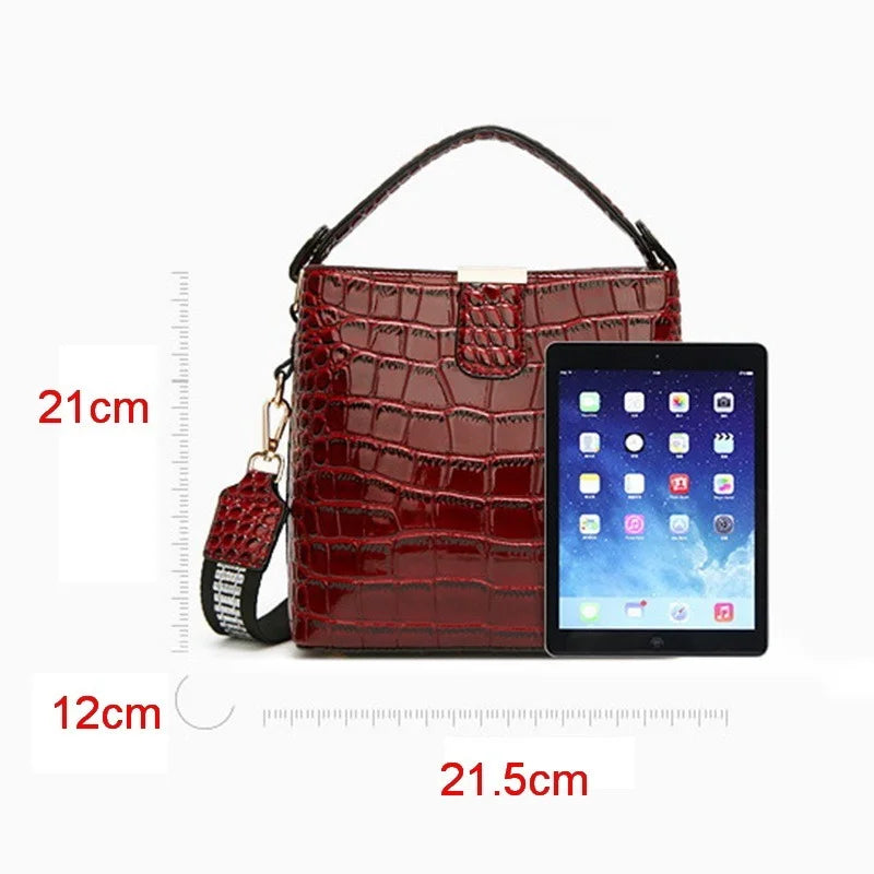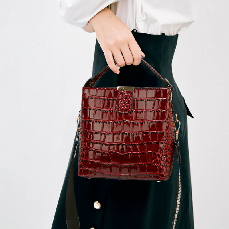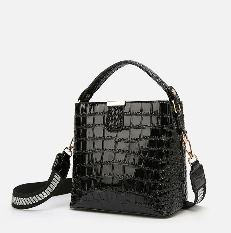 Elevate your style with this fashionable crocodile pattern handbag. Made from patent leather, this bucket bag is perfect for summer.