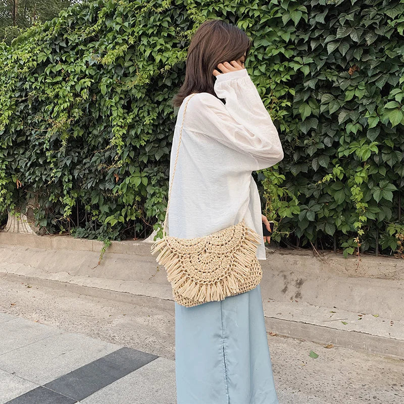 Elevate your summer style with this beautiful handwoven straw bag featuring tassel accents. Perfect for the beach or a vacation getaway.