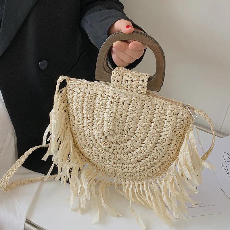 Summer Tassel Straw Bag Wooden Beach Shoulder Crossbody Rattan Bolsa