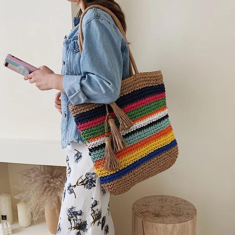 Stay stylish and organized with this woven handbag featuring a tassel design. Perfect for everyday use.