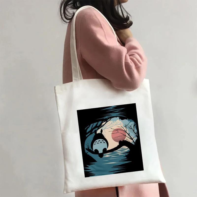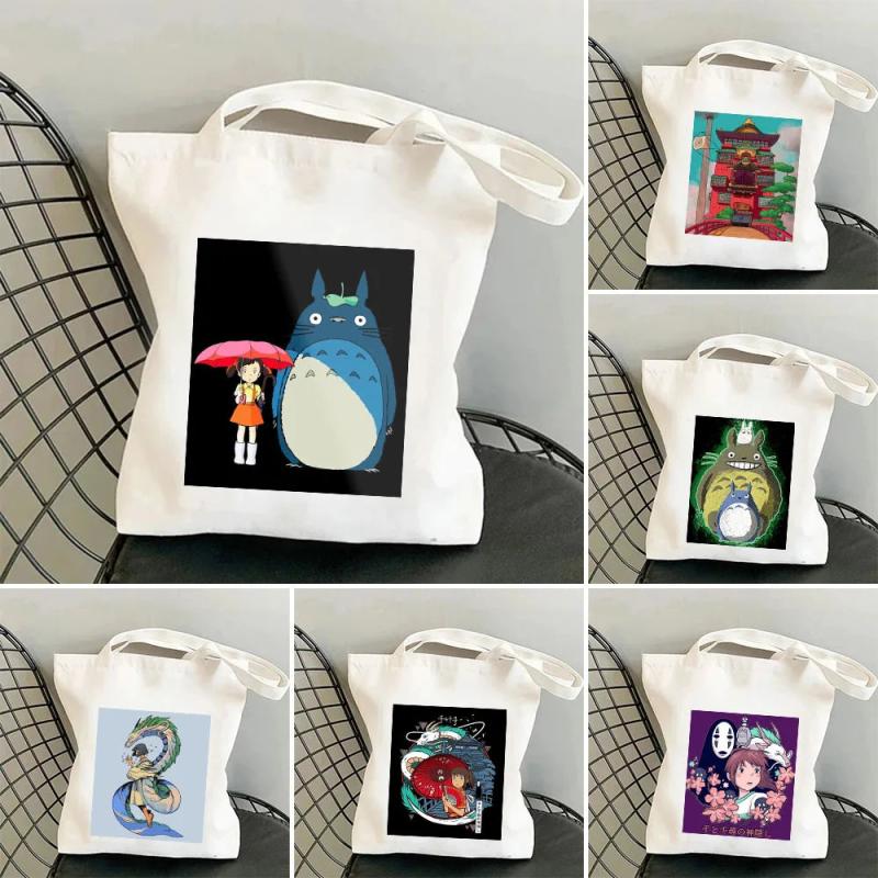 Adorable Totoro-themed canvas shoulder bag perfect for shopping, carrying groceries, or everyday use. This eco-friendly and foldable bag features a Spirited Away design.