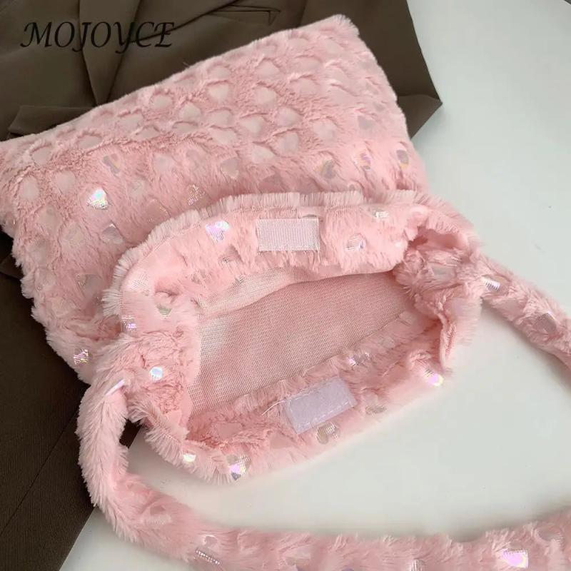 This underarm bag features a cute heart pattern design and is made of soft plush material. It has a large capacity for all your essentials.