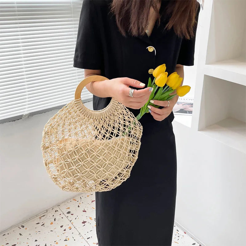 Vintage Straw Woven Beach Handbag Hollowed Out Holiday Bag