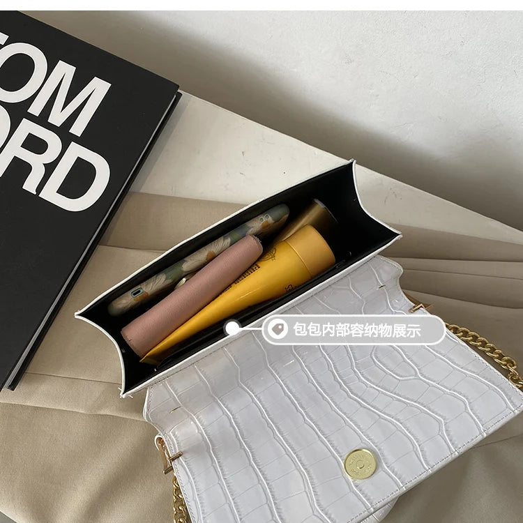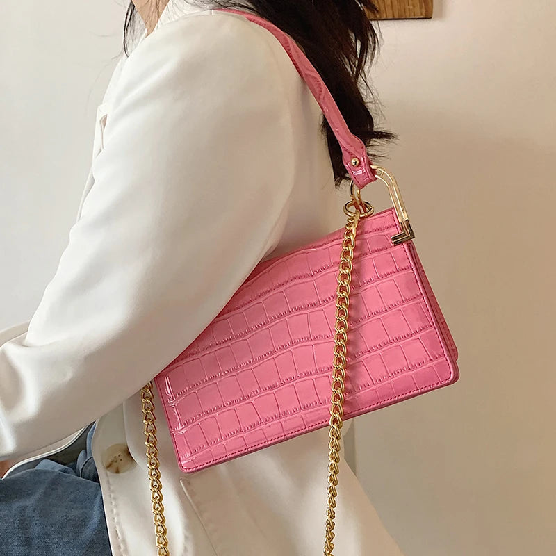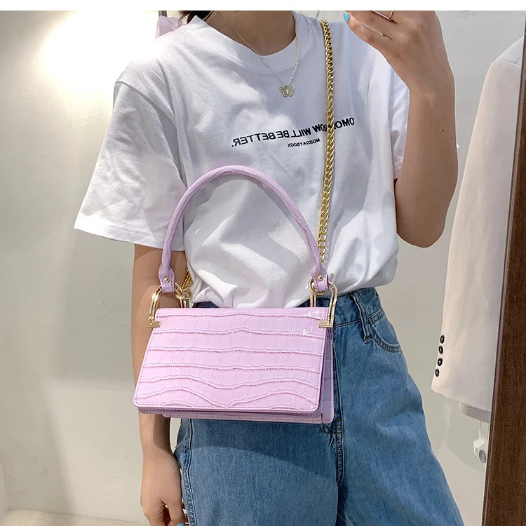 This stylish shoulder bag features a crocodile pattern and a candy chain design. The perfect accessory for any outfit.