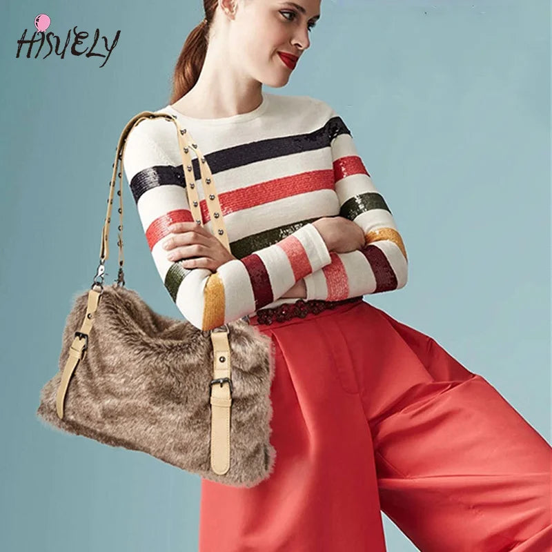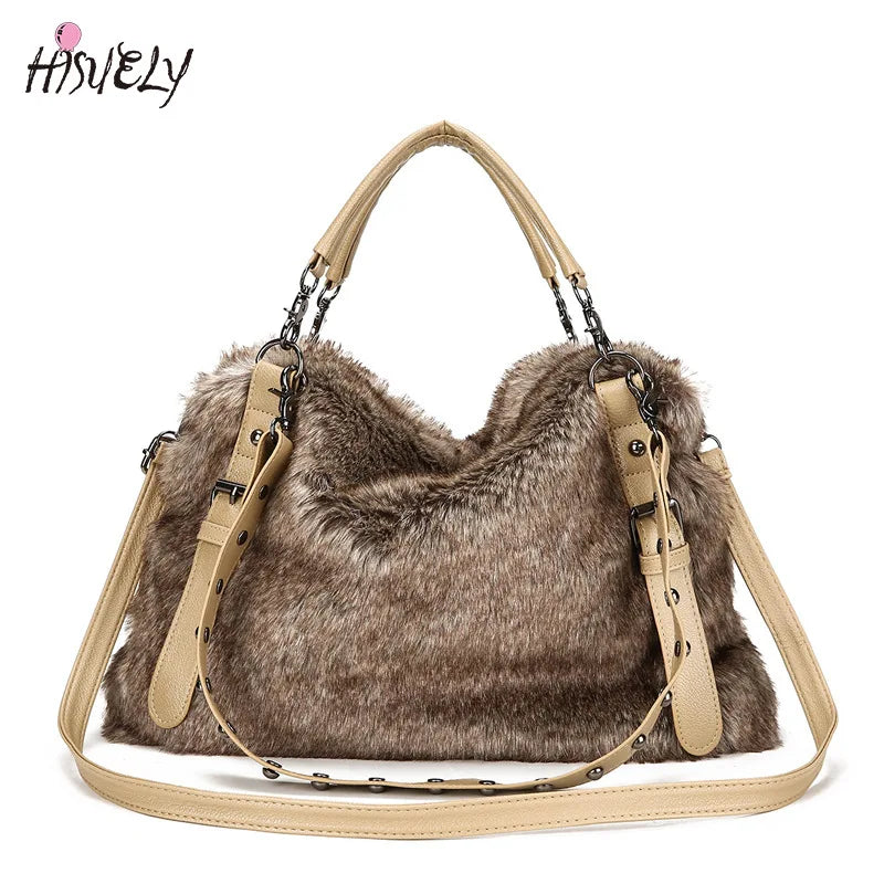 Stay warm and stylish with this plush handbag featuring a large capacity design and rivet details.
