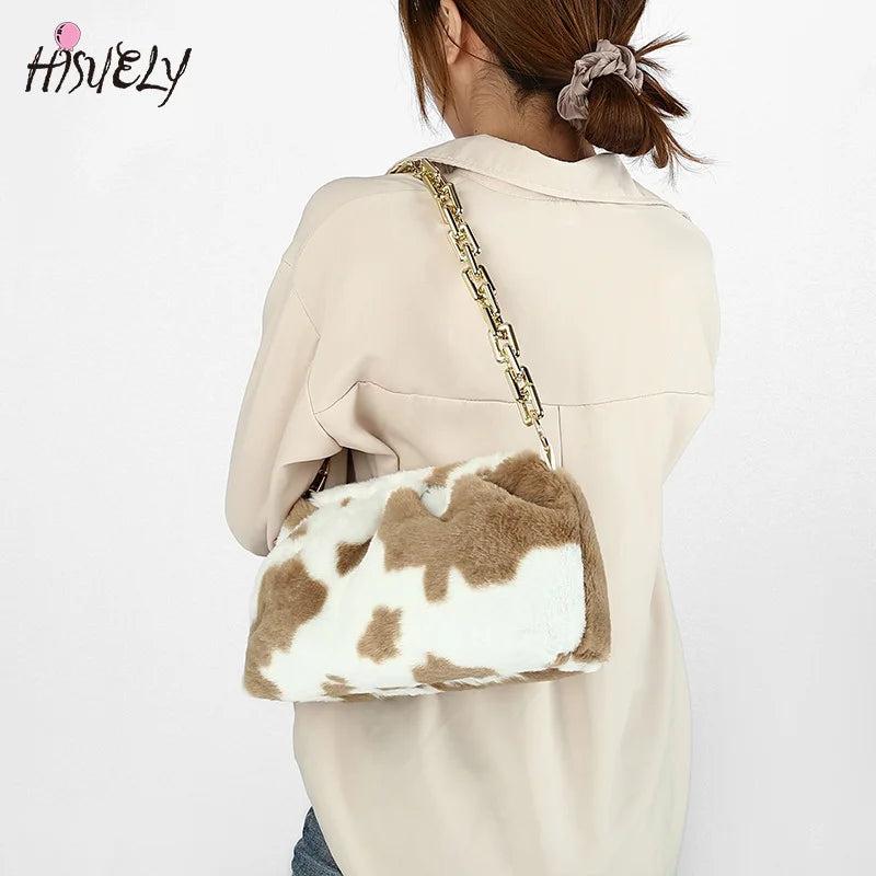 Winter Plush Chain Shoulder Bag Retro Cow Pattern Underarm Handbag