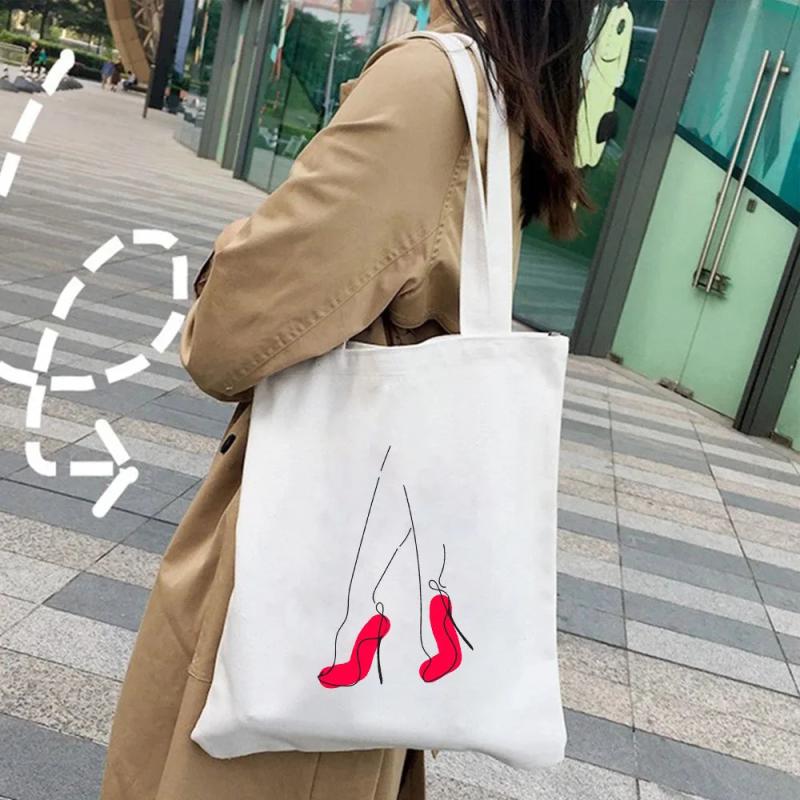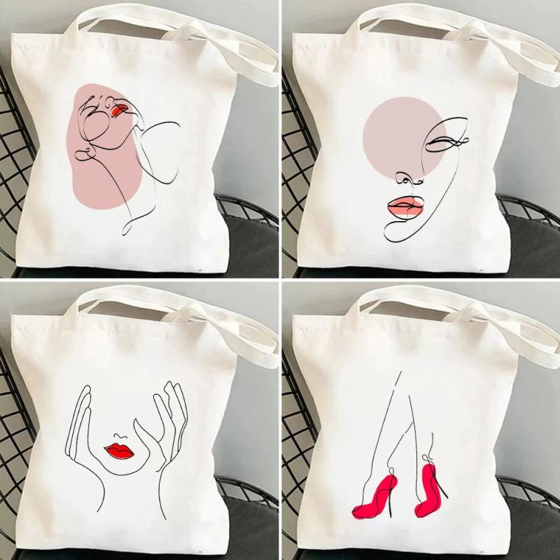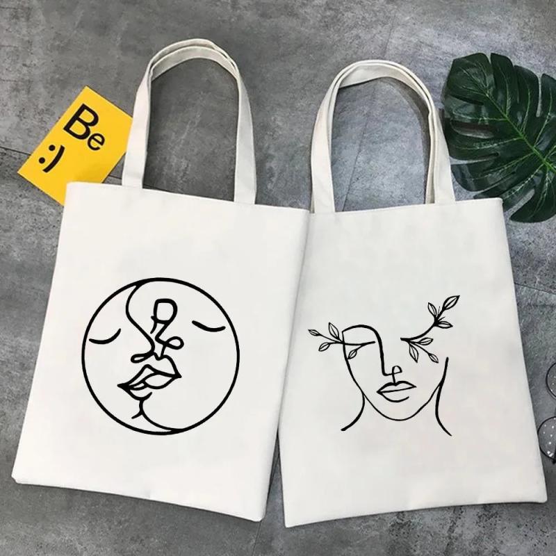 This eco-friendly cotton handbag features a minimalist woman face art design, perfect for carrying your essentials in style.