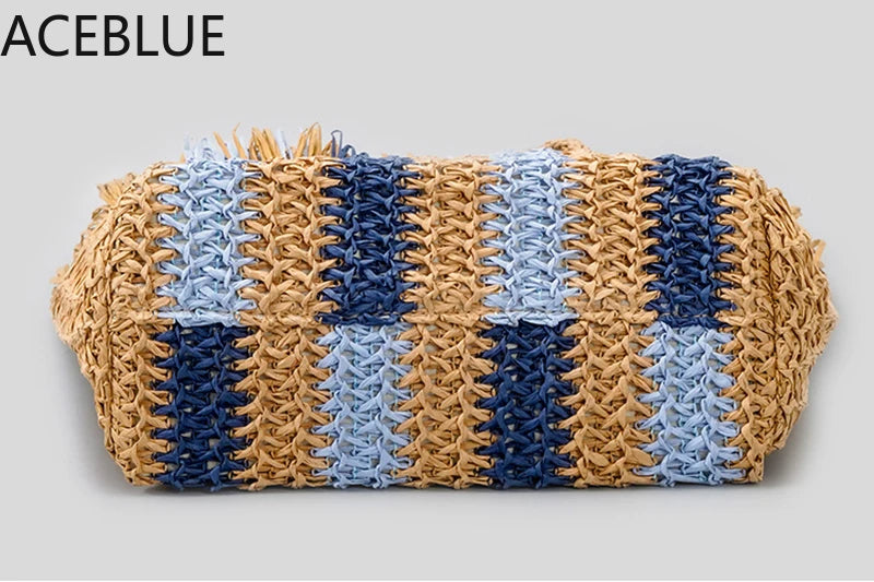Stay stylish this spring and summer with this casual beach straw bag. Perfect for carrying all your essentials with its large capacity. Features a trendy striped design with fringe details.