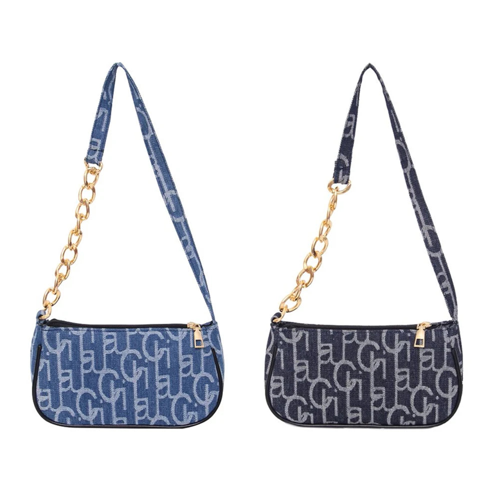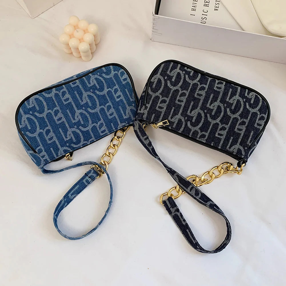 Women's Denim Chain Shoulder Bag Small Letters Print Handbag Zipper Underarm Bag