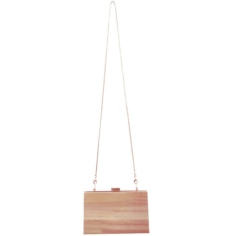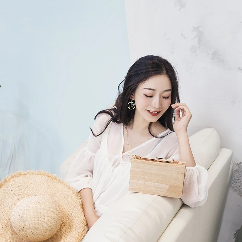 Elegant wooden clutch bag with metal hasp for weddings and parties.