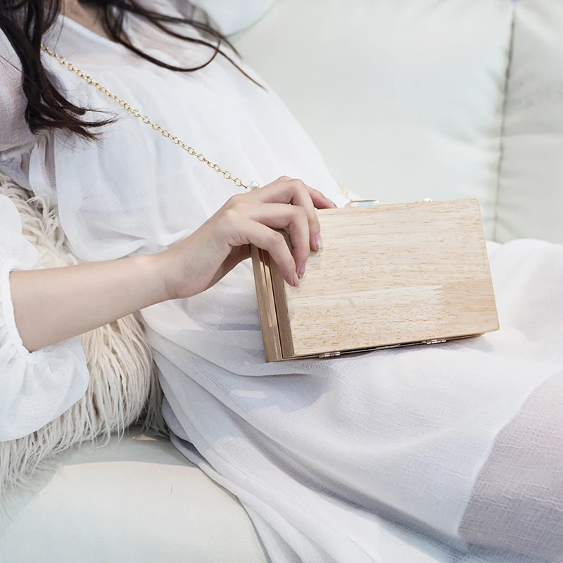 Description:Elegant wooden clutch bag with metal hasp for weddings and parties.Features: Stylish wood shoulder messenger bag design Perfect for evening events and parties Secure metal hasp closure for belongings Ideal for weddings or formal occasions Unique solid wood wallet that stands out This product may be available in additional colours...