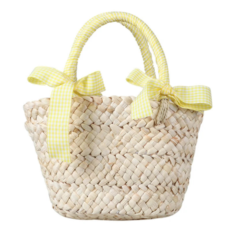 This adorable handbag features a woven design with a charming bow knot accent, perfect for children to carry their essentials. Ideal for summer outings and beach trips.