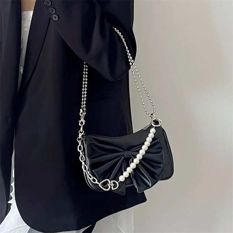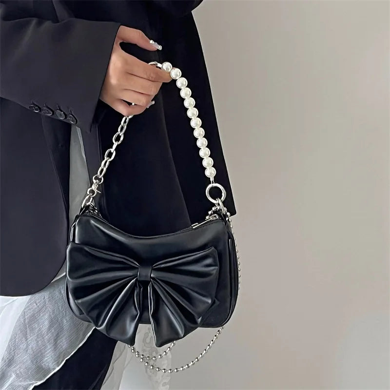 Upgrade your style with this fashionable Y2K shoulder bag featuring a bow design and chain strap. Made of high-quality PU leather, this underarm bag is perfect for autumn.