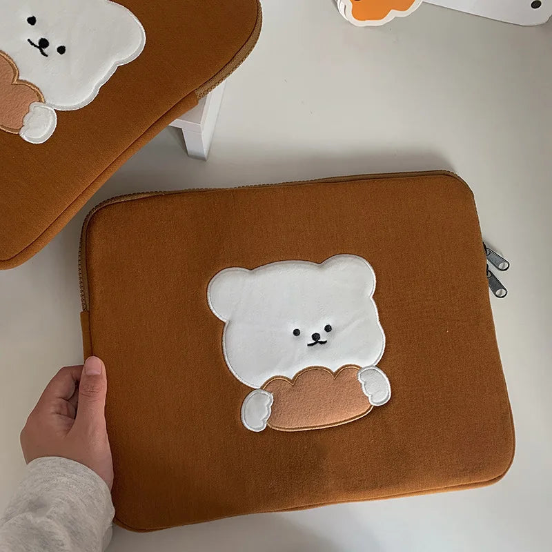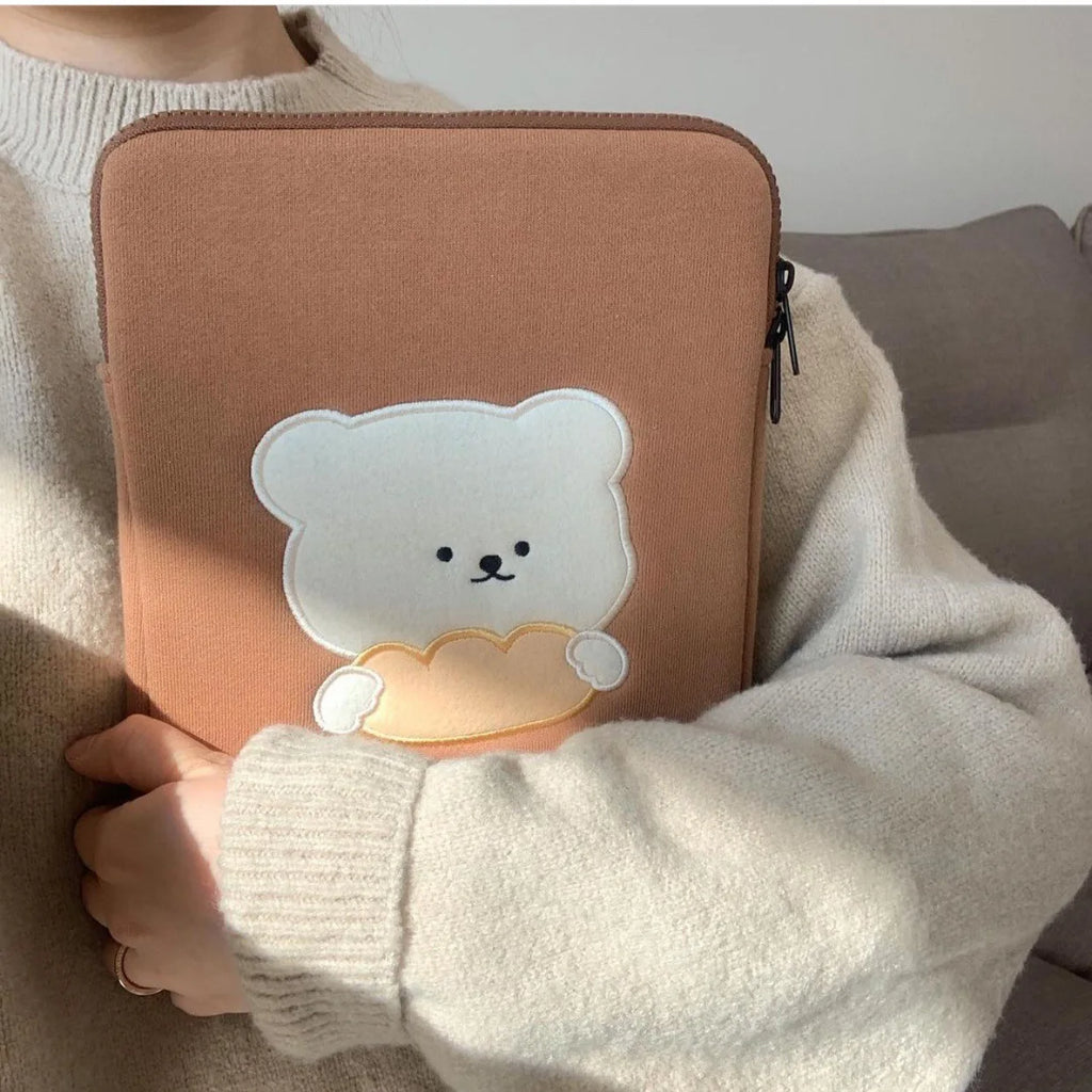 Protect your iPad with this cute and soft sleeve made of high-quality Korea cotton. Features a cartoon embroidery bear design that adds a touch of charm. Available in 11, 13, and 15-inch sizes.