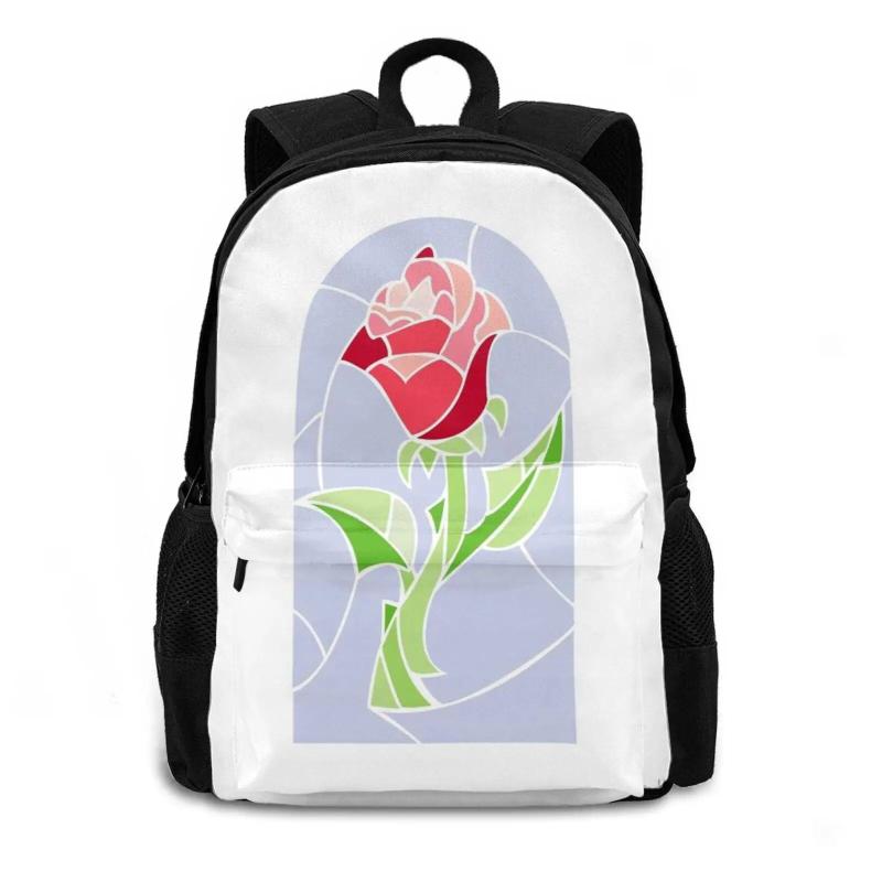 This laptop bagpack features a beautiful Stain Glass Rose design inspired by Beauty and the Beast. It's perfect for travel and everyday use.