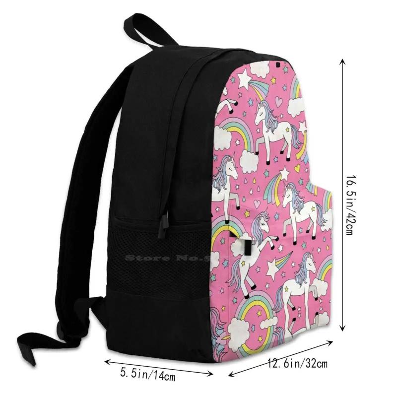 Adorable unicorn and rainbows pattern laptop bagpack in pink color with shooting star design, perfect for travel.