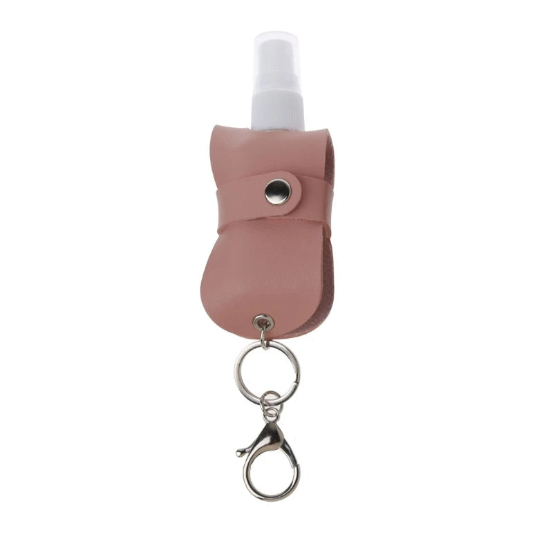 Convenient 50ml refillable spray bottle with a leather keychain holder for easy carrying. Leakproof design ensures mess-free travel. Perfect for various liquids like hand sanitizer, perfume, and more.