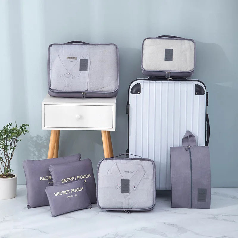 Keep your travel essentials organized with this set of 8 packing cubes. Includes bags for clothes, shoes, underwear, and more. Perfect for keeping your luggage neat and tidy.
