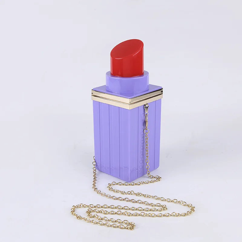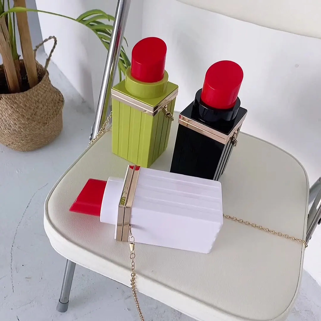 This stylish bag is designed in the shape of a lipstick. It can be used as a clutch or shoulder bag for evening events. Comes with a chain strap.