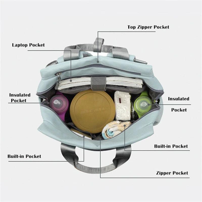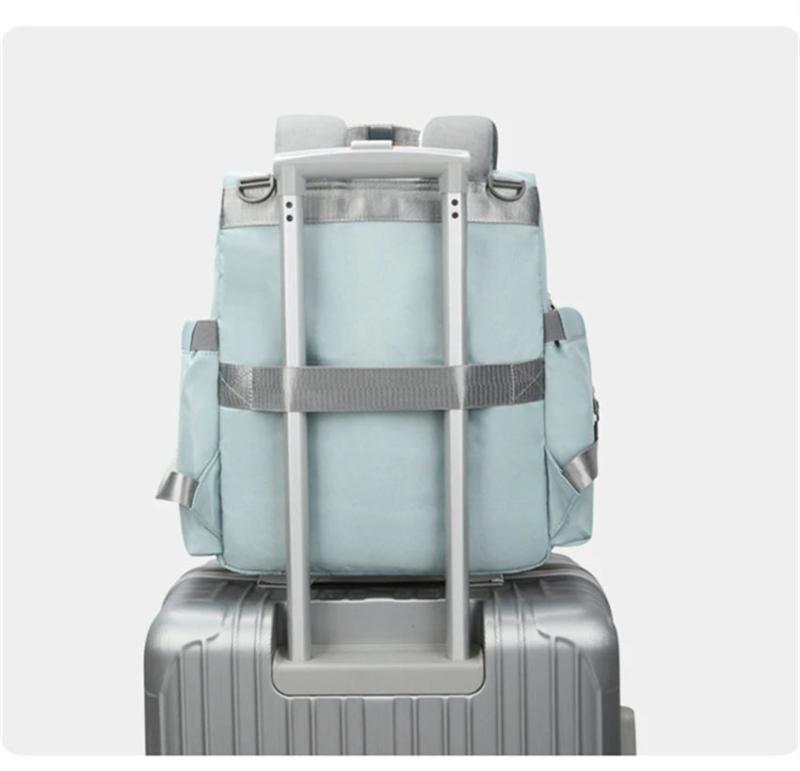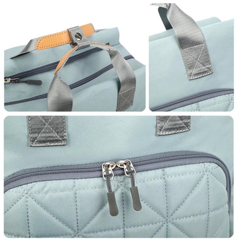This Amiqi baby bag features a functional design with a changing station, portable bed, travel bassinet, folding crib, and shade cloth changing pad.