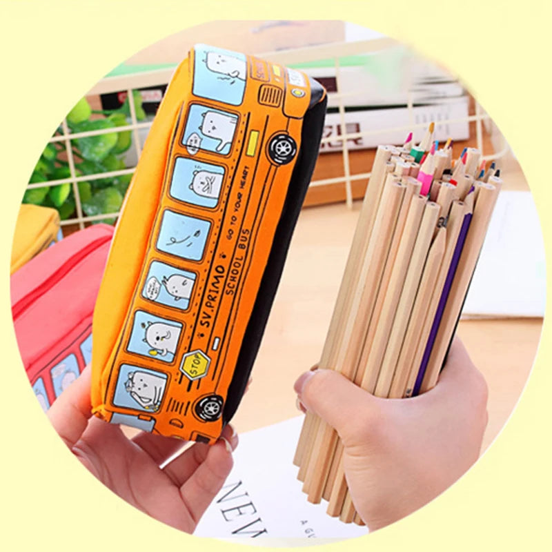 This small and large capacity bus pencil case is perfect for male and female students. Made of durable canvas material.