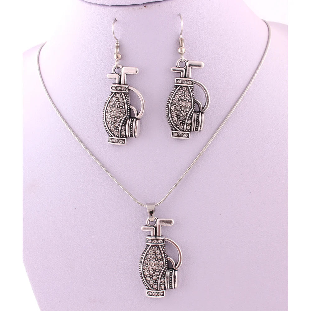 This stunning set features an antique silver plated zinc golf bag pendant studded with sparkling crystals. The set includes a matching necklace and earrings.