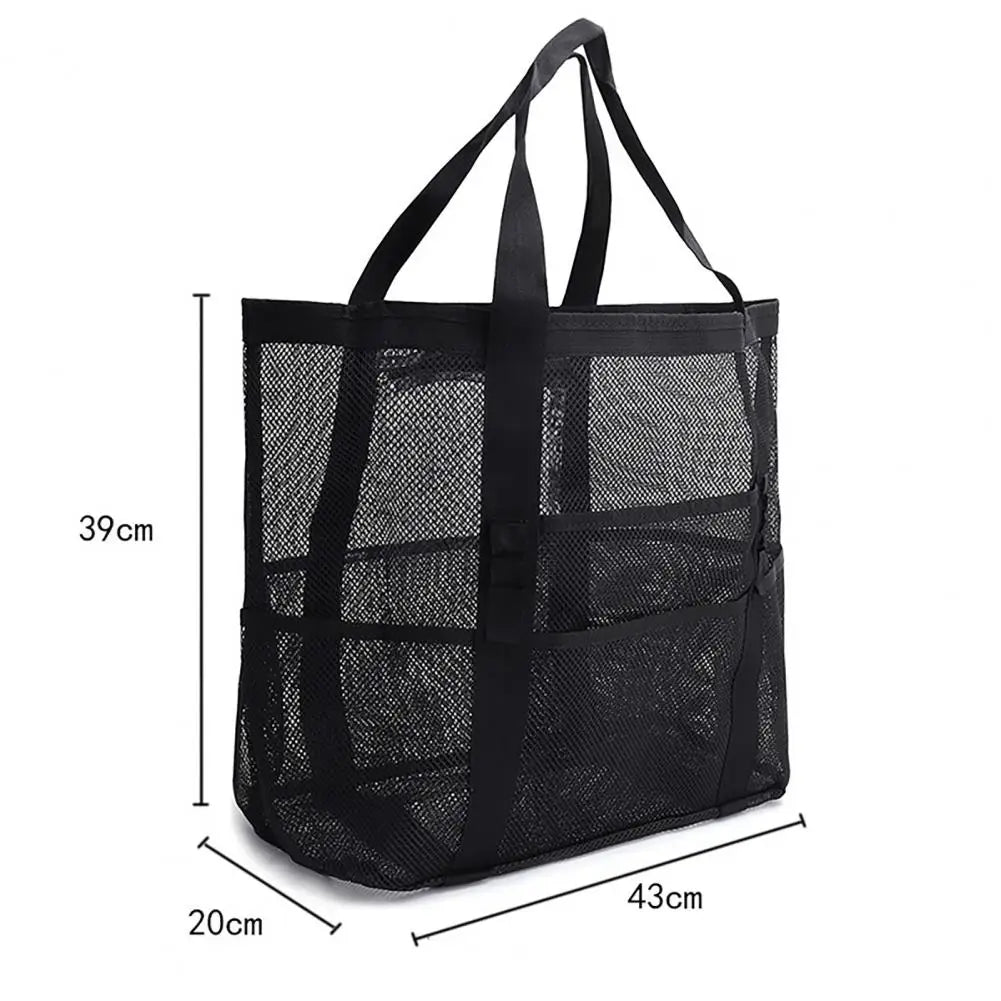 This beach mesh bag is designed with a hollow out waterproof and sandproof material, featuring multi-pocket storage, reinforced handle, large capacity, and foldable design for convenient use. Perfect for carrying groceries, toys, or beach essentials.