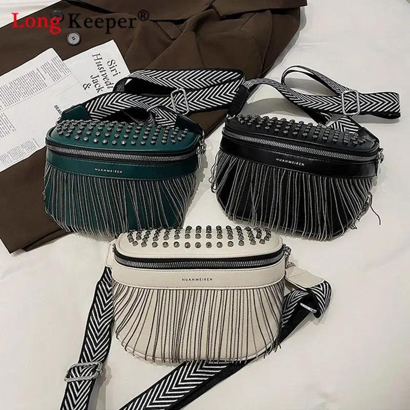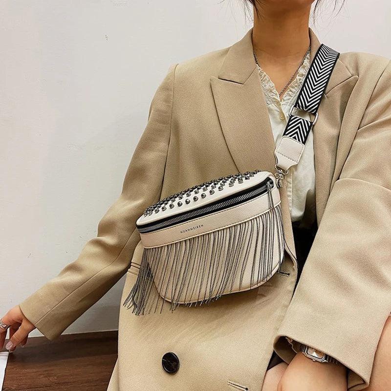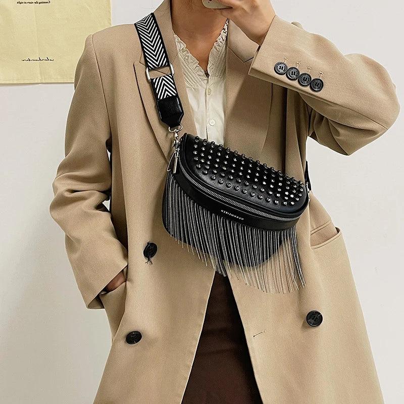 • Fashionable chest bag with a tassel and rivet design