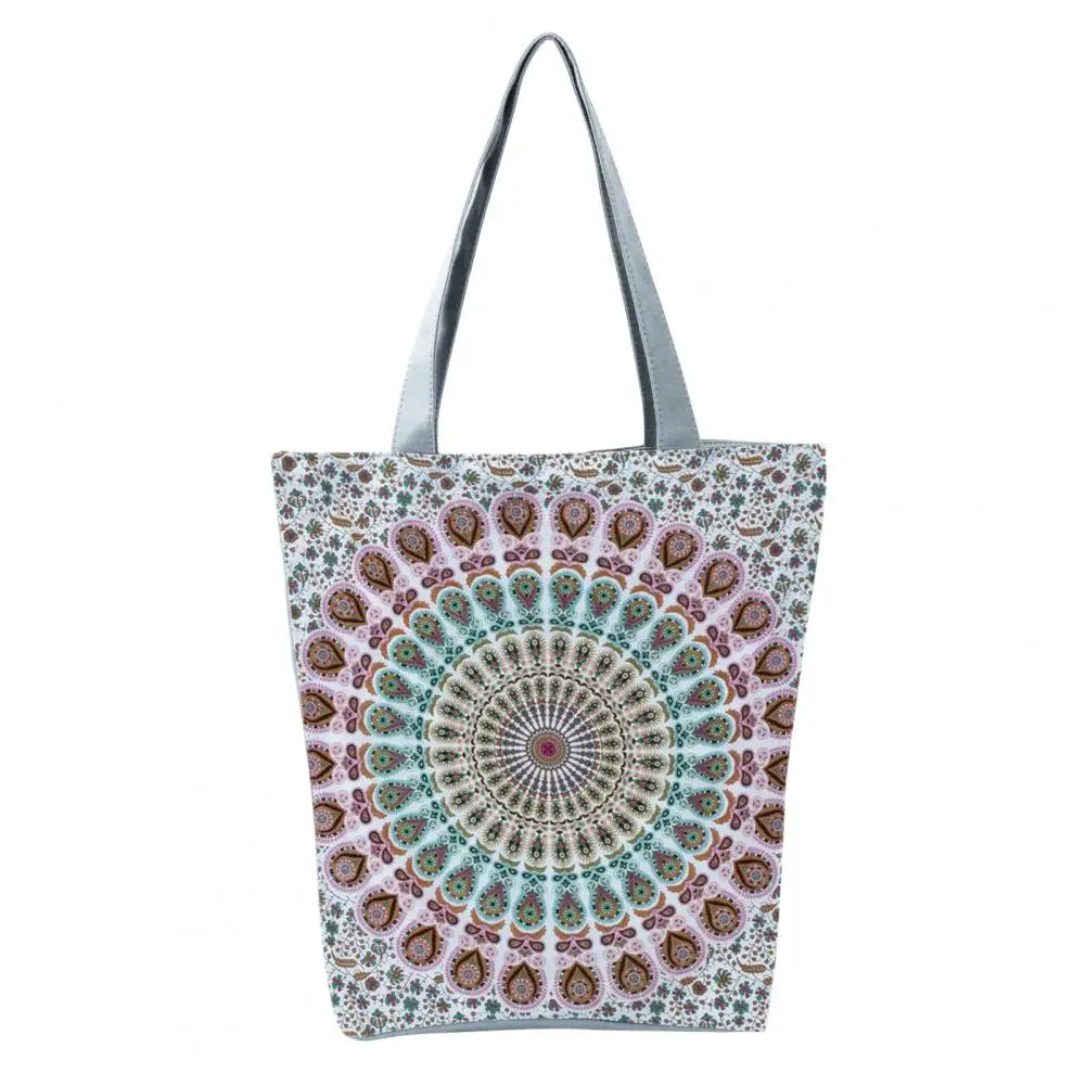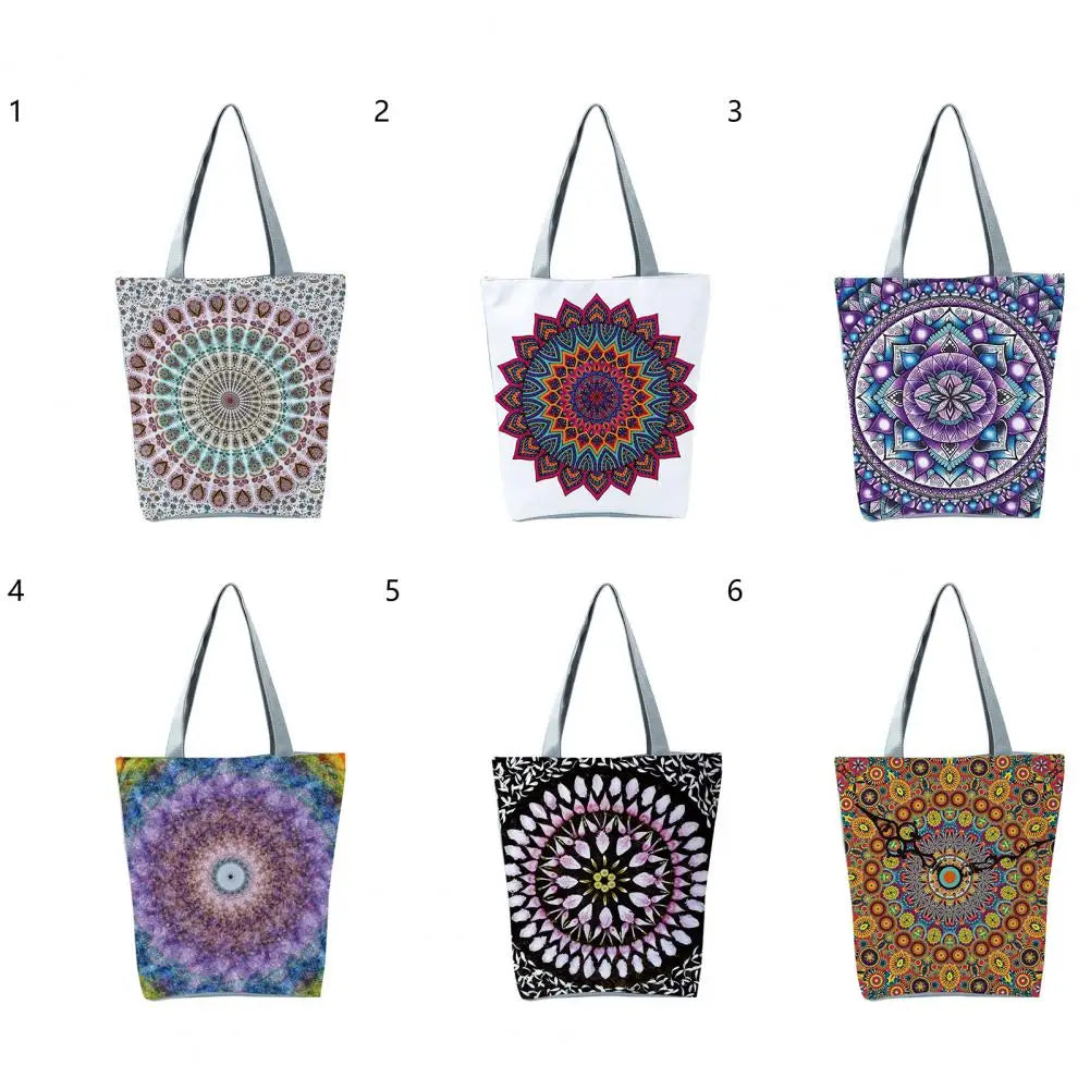 This foldable handheld shoulder bag features a bohemia round print design and offers large capacity for school or travel use.