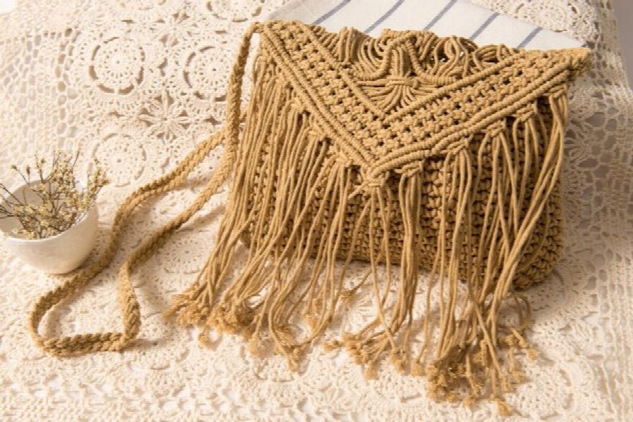 Stay stylish with this casual straw bag that features a hollow out design, tassel details, and a cotton rope shoulder strap. Perfect for the beach or everyday use.