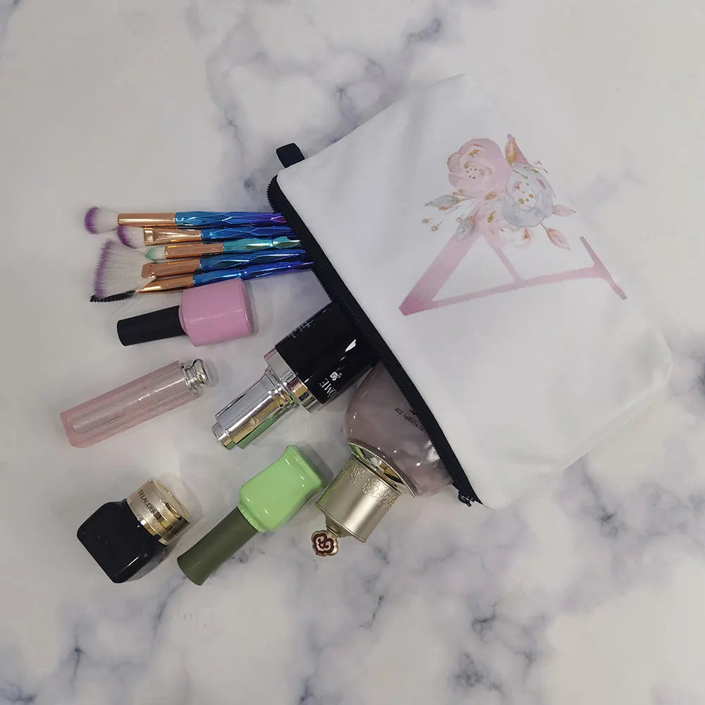 This makeup bag organizer is perfect for brides, bridesmaids, and the bridal party. It features heat transfer flowers and alphabet printing, making it a stylish and practical accessory. Carry all your makeup necessities in this convenient pouch.