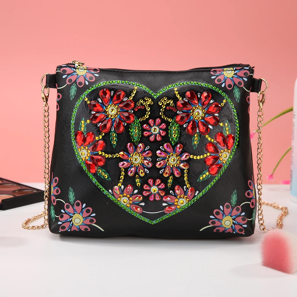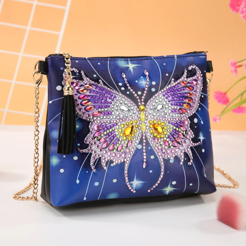 Create your own stylish leather crossbody bag with diamond painting of butterfly and flower design. Perfect for carrying your essentials in a unique and artistic way.