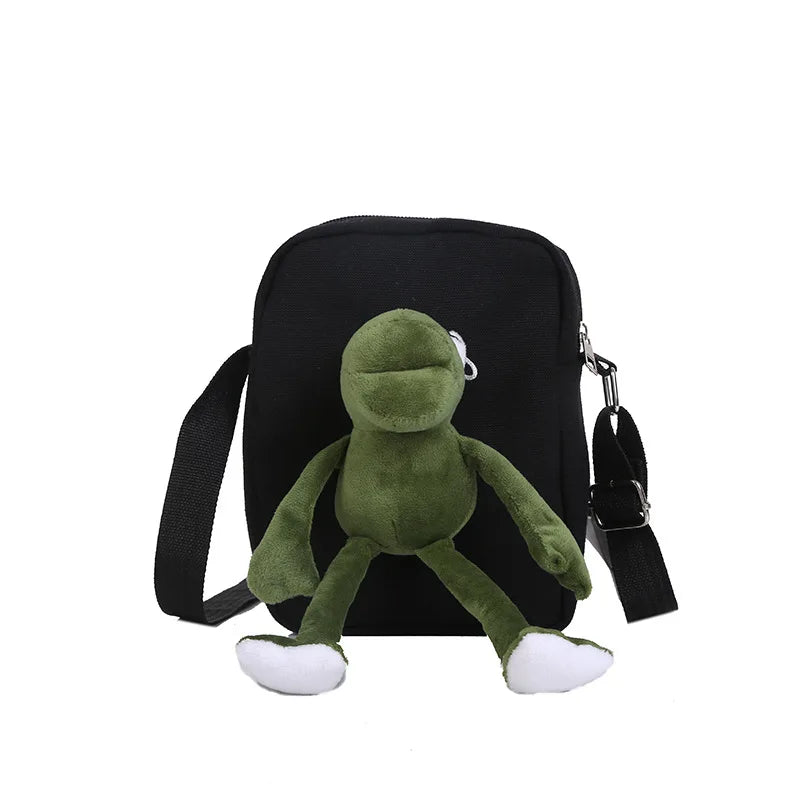 Stay stylish this summer with this small canvas messenger bag featuring a cute doll frog design. Perfect for carrying your essentials.
