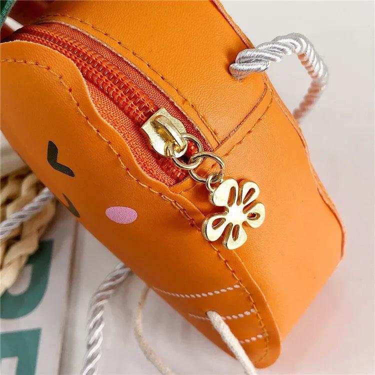 This adorable carrot crossbody bag is perfect for children and toddlers. It's a cute and stylish accessory for girls.
