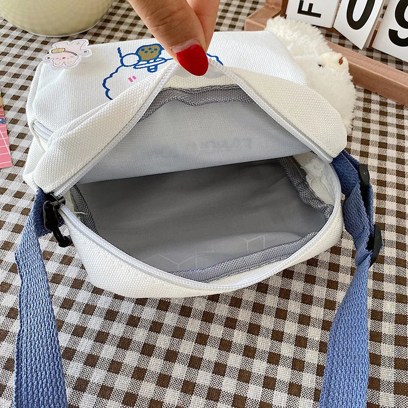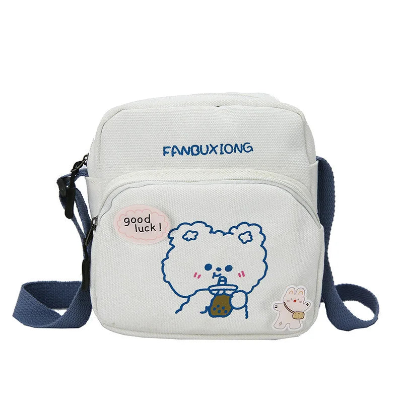This cute and practical messenger bag is perfect for students. It features a cartoon bear design and is made of durable canvas. The adjustable shoulder strap ensures a comfortable fit.