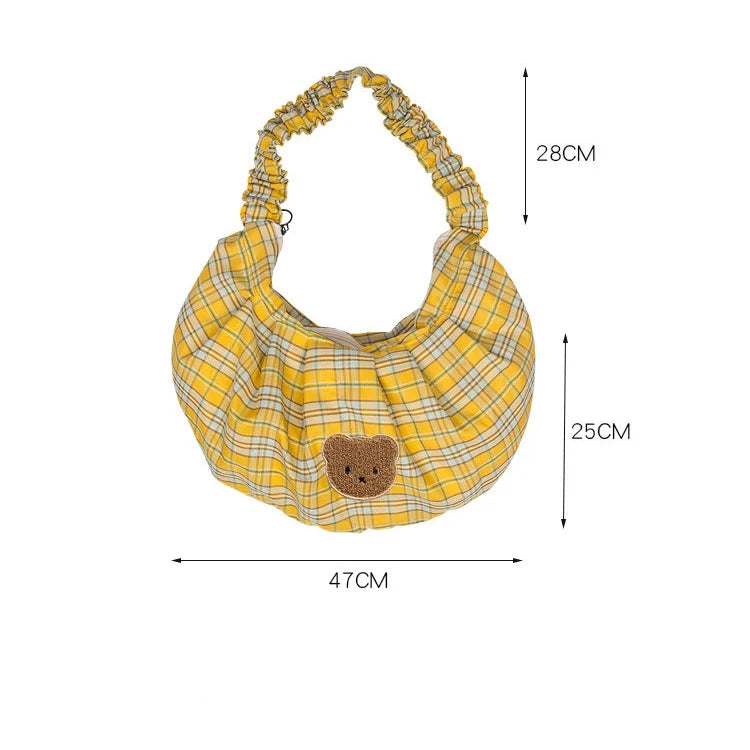 This wide shoulder bag is perfect for casual outings, featuring a big lattice bear pattern design. It can be worn as an inclined bag and offers ample space for your essentials.