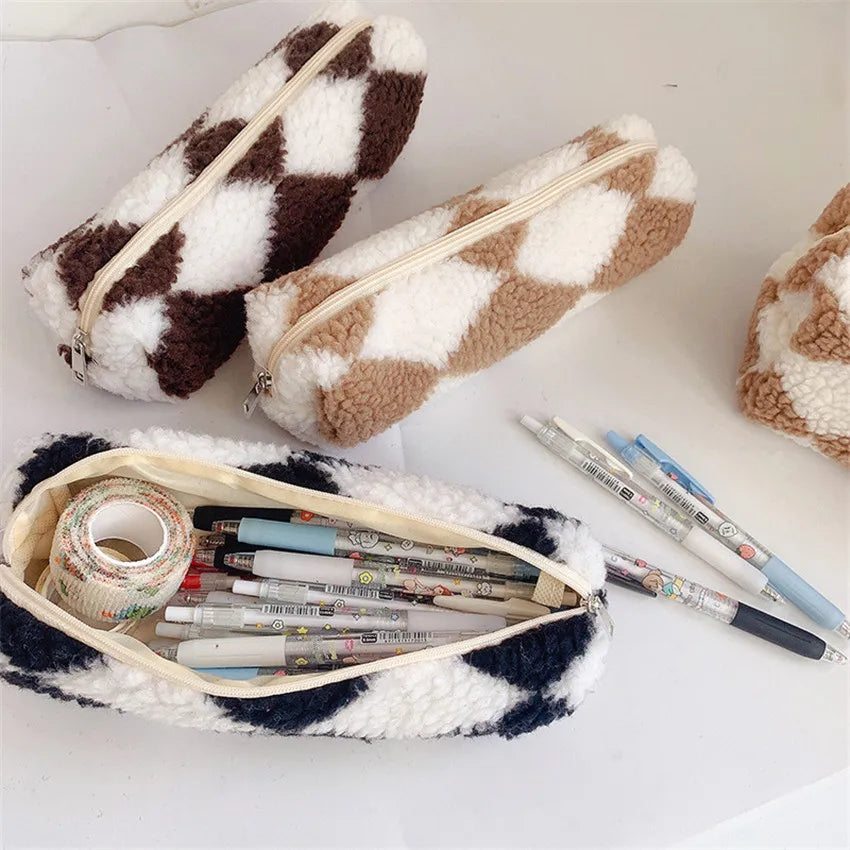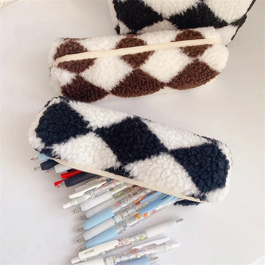 Checkerboard Flannel Pencil Case Large Capacity Stationery Bag