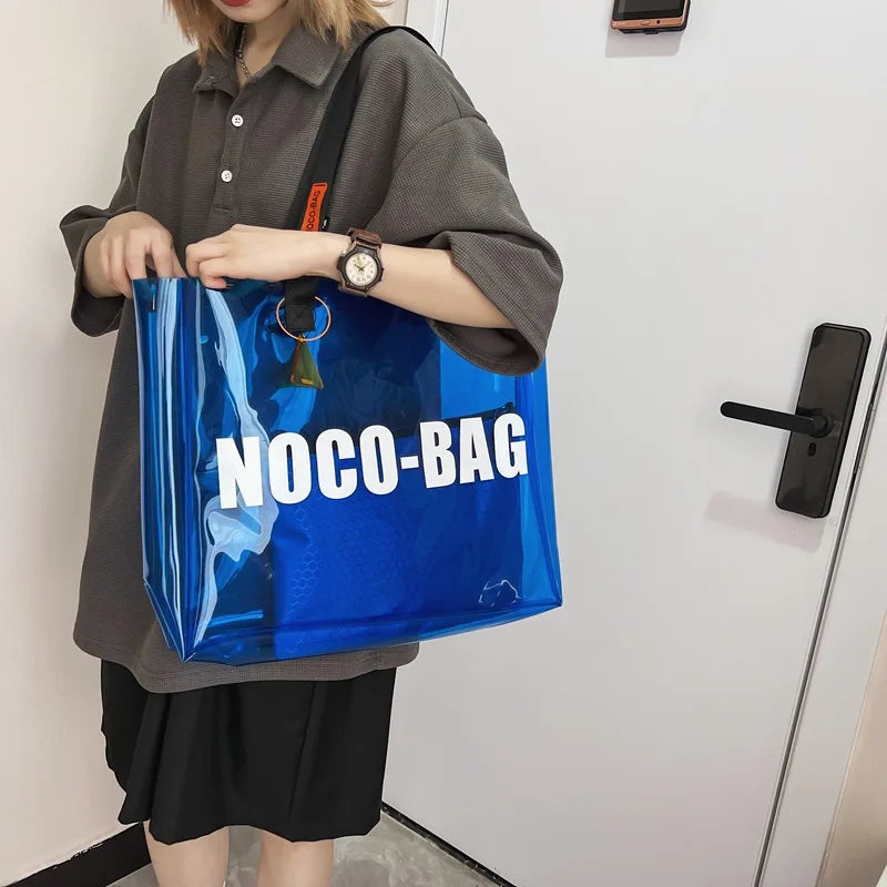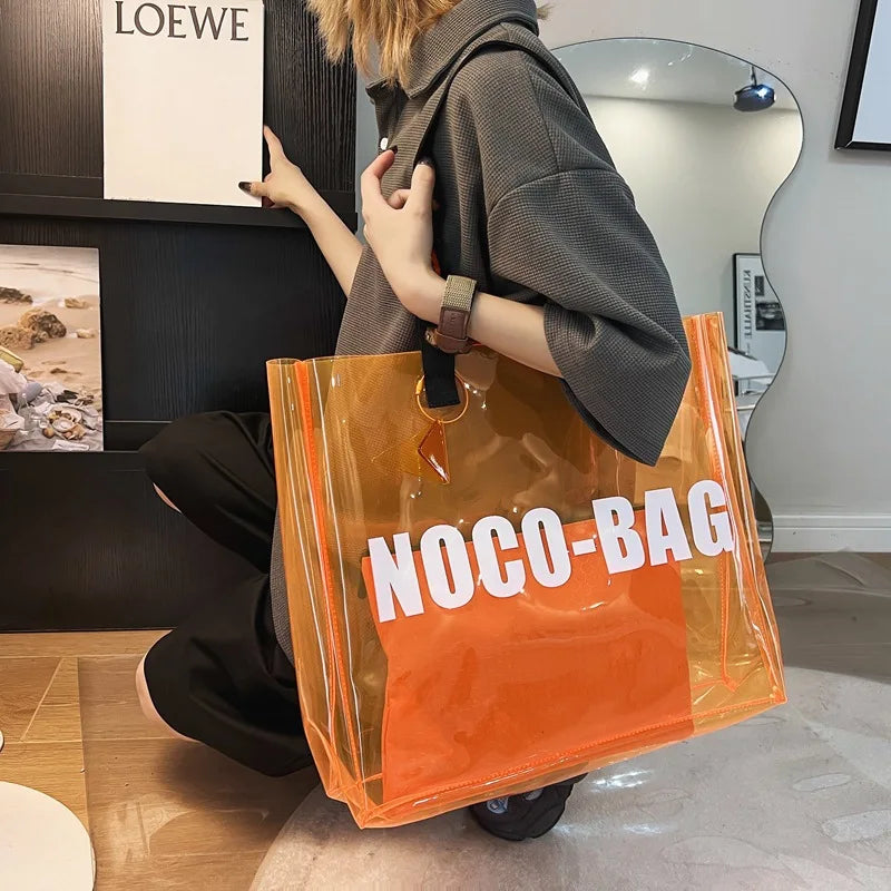 Stylish and functional clear tote bag with PVC letters, perfect for casual outings or beach trips. The see-through design adds a trendy touch to your outfit.