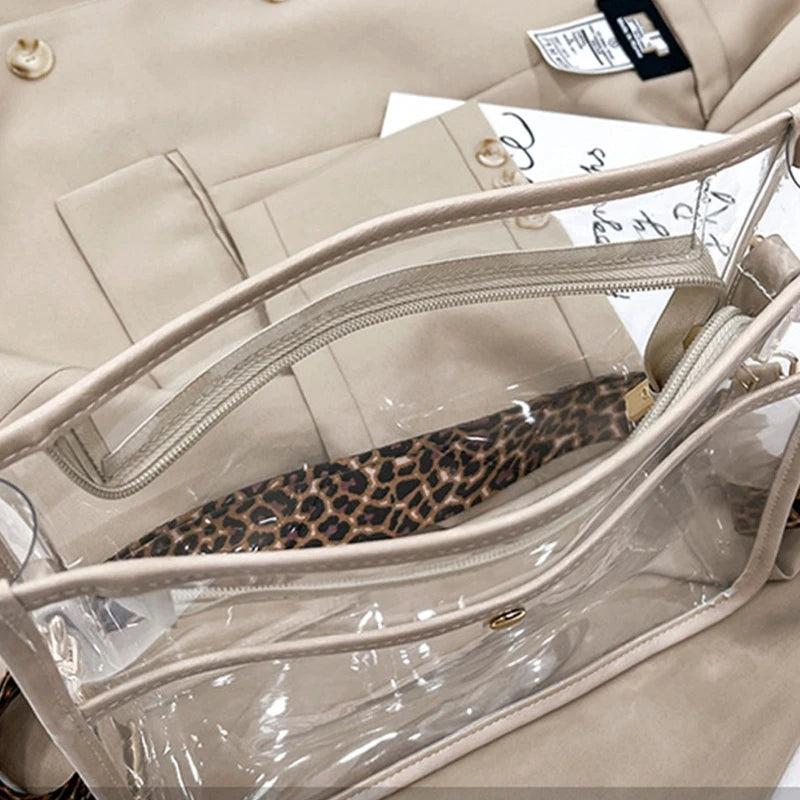 Stay on-trend with this stylish clear tote bag featuring a leopard print guitar strap. Perfect for a day out or a casual night out.