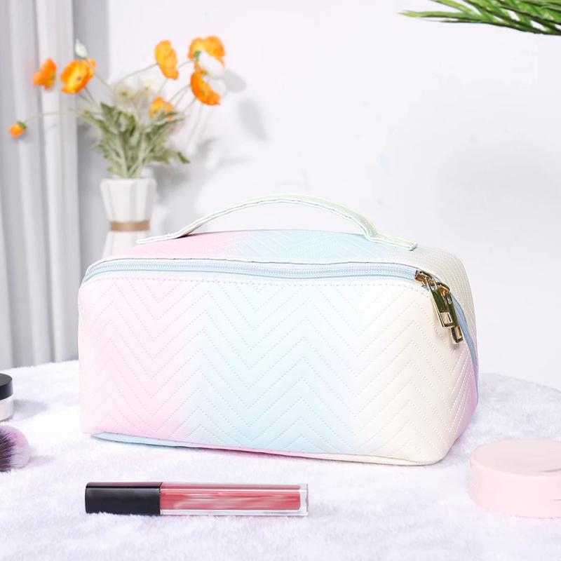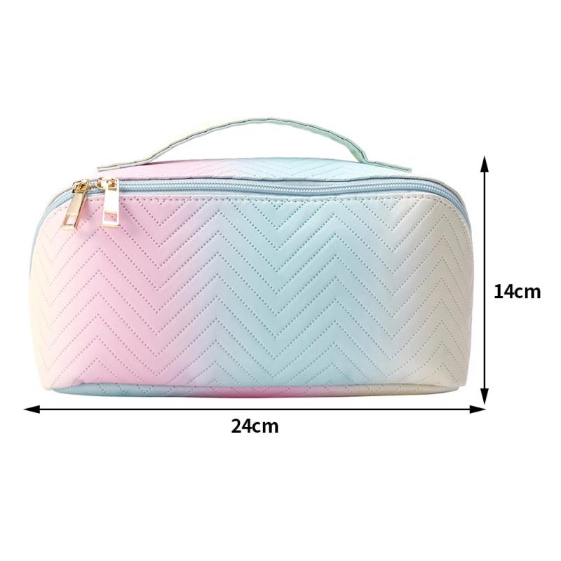 This stylish make up bag features a wavy gradient pattern and is made of high-quality PU leather. It has a large capacity, a portable design, and a zipper closure for secure storage of your cosmetic tools and products.