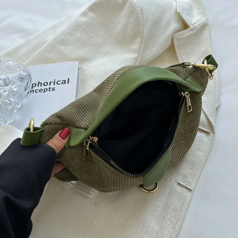 This waist bag is perfect for the winter season, featuring a corduroy material and a versatile design that can be worn as a belt bag or crossbody. It is ideal for carrying your phone and other essentials in a stylish and convenient way.