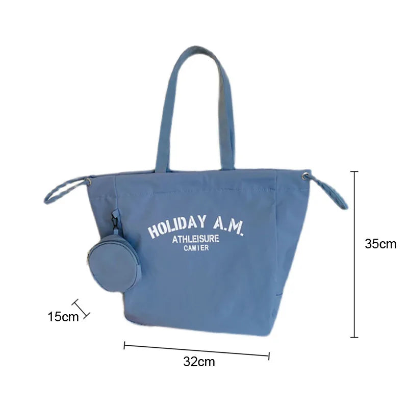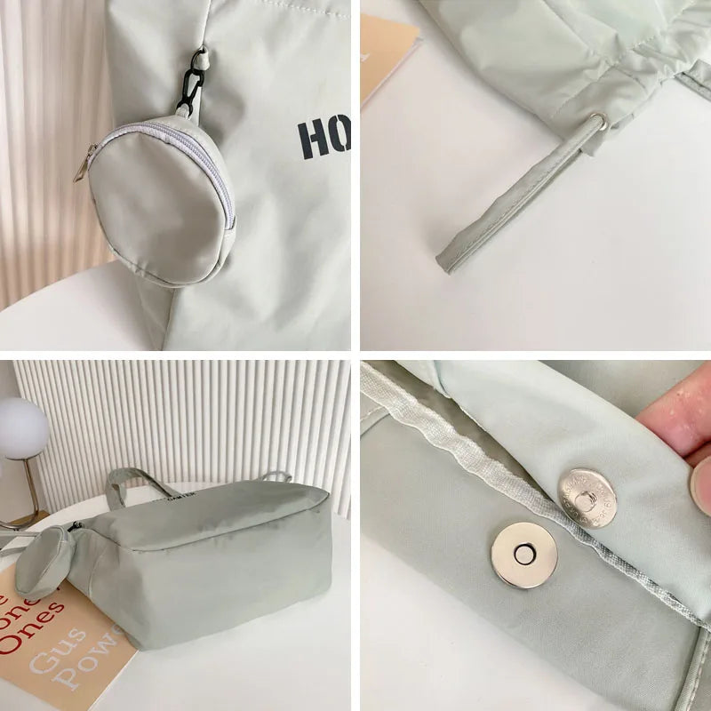 This versatile shoulder bag is made of waterproof cotton canvas with a drawstring closure and magnetic buckle for added security. It's perfect for carrying school essentials or everyday items.