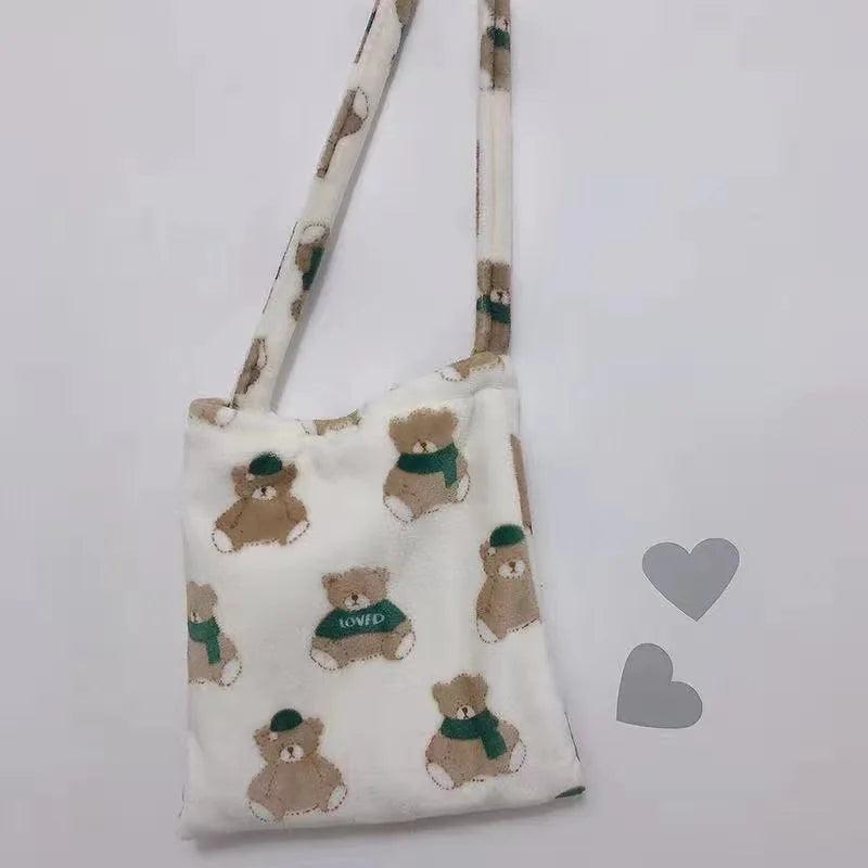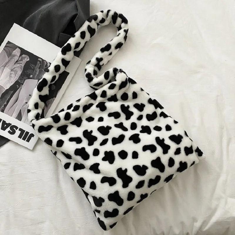 Stay stylish and cozy with this fluffy plush shoulder bag featuring a cute cow bear pattern. Perfect for autumn and winter, this spacious tote is ideal for students or casual use.