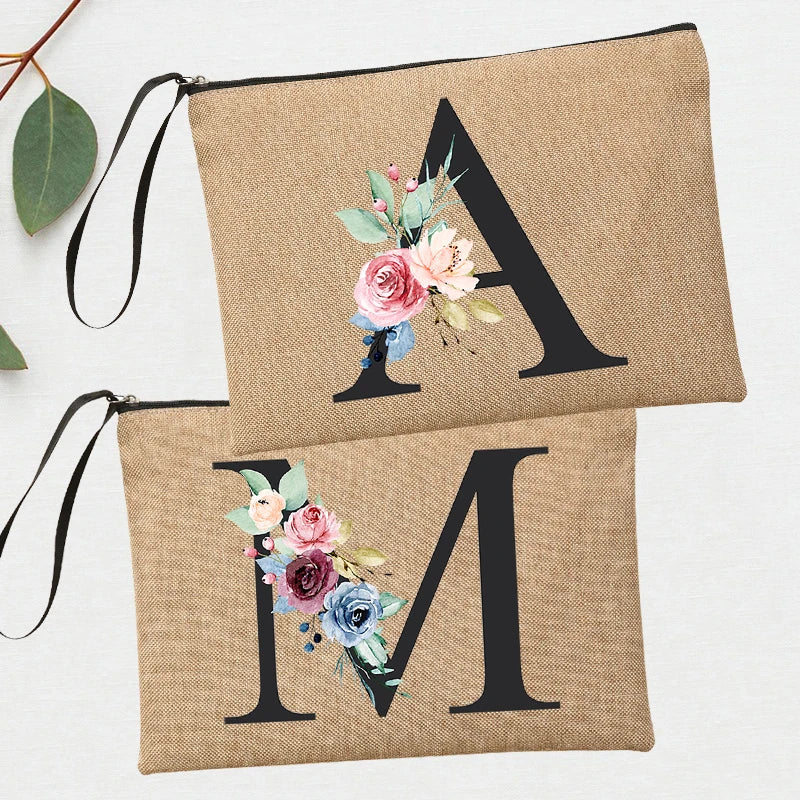 This personalized summer bag features a beautiful flower design with your chosen initial. Perfect for bachelorette parties or as a bridesmaid gift. Use it as a makeup clutch or organizer case.