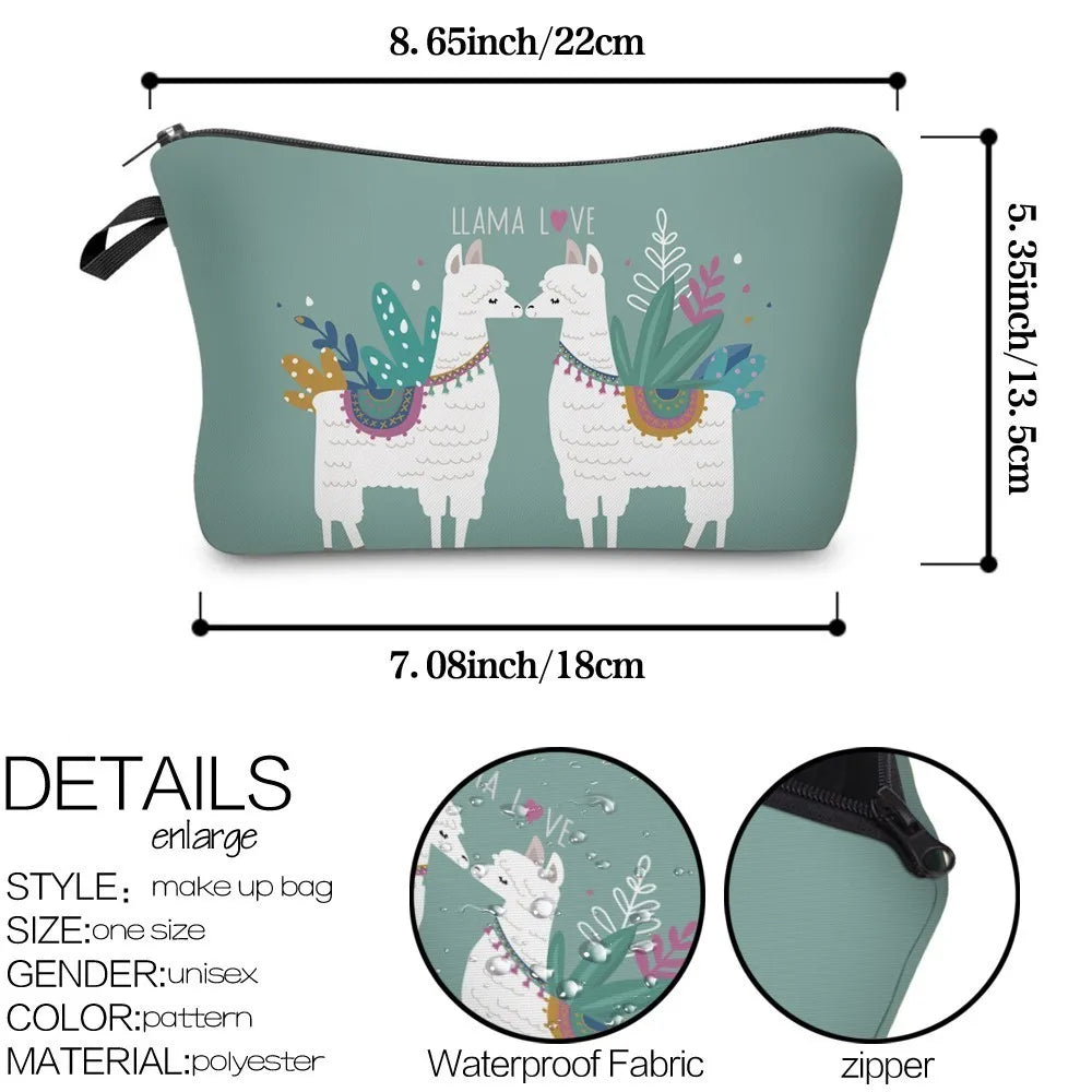 Stay organized on-the-go with this waterproof makeup bag featuring a charming llama love print. Perfect for storing your cosmetics and toiletries while traveling.