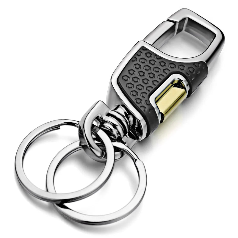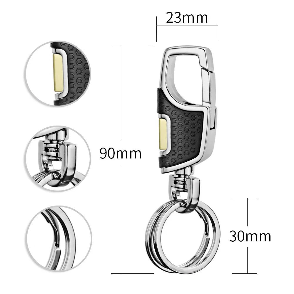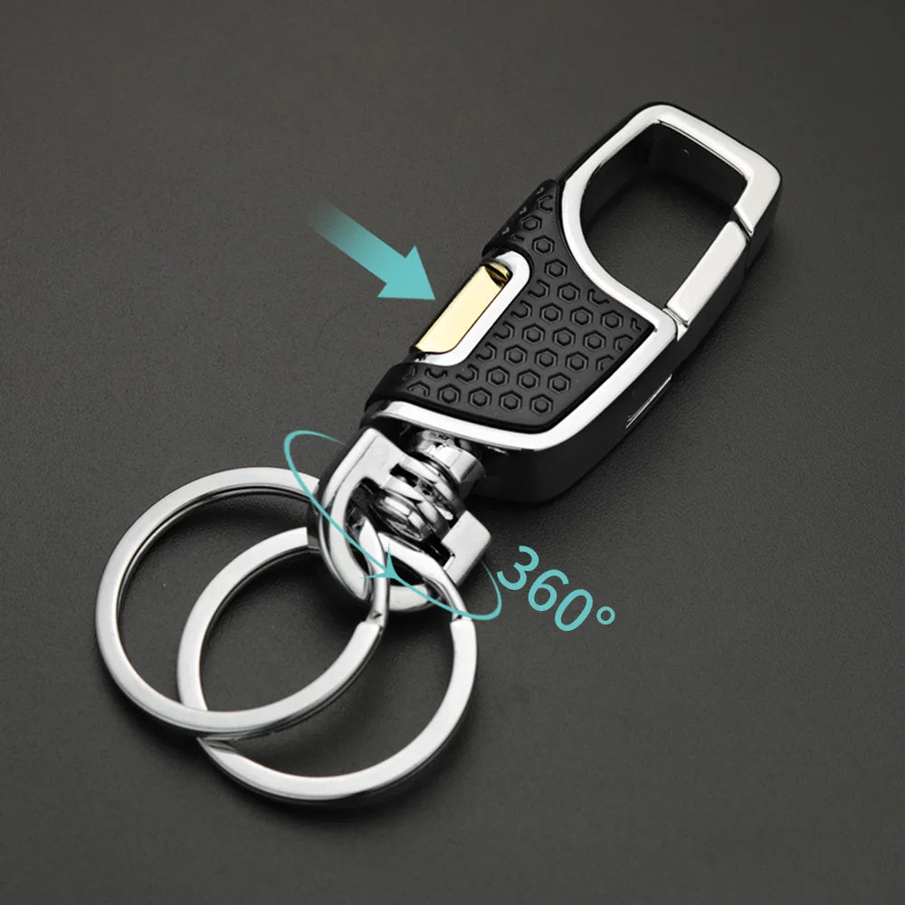 This double switch keychain features a 360-degree rotatable design, making it convenient to access your keys. It is made of metal and includes key holder rings for easy organization. The perfect accessory for men's car keys.