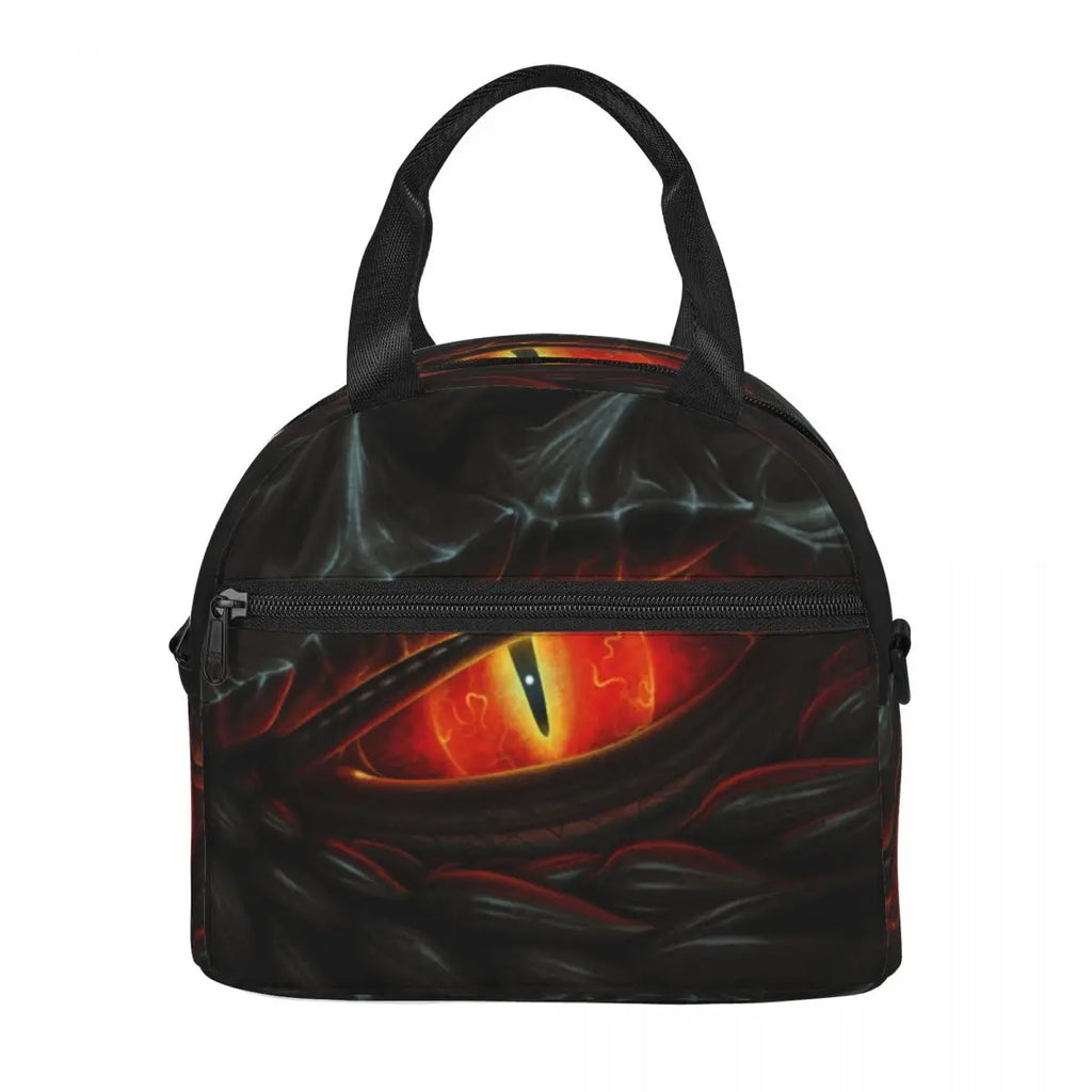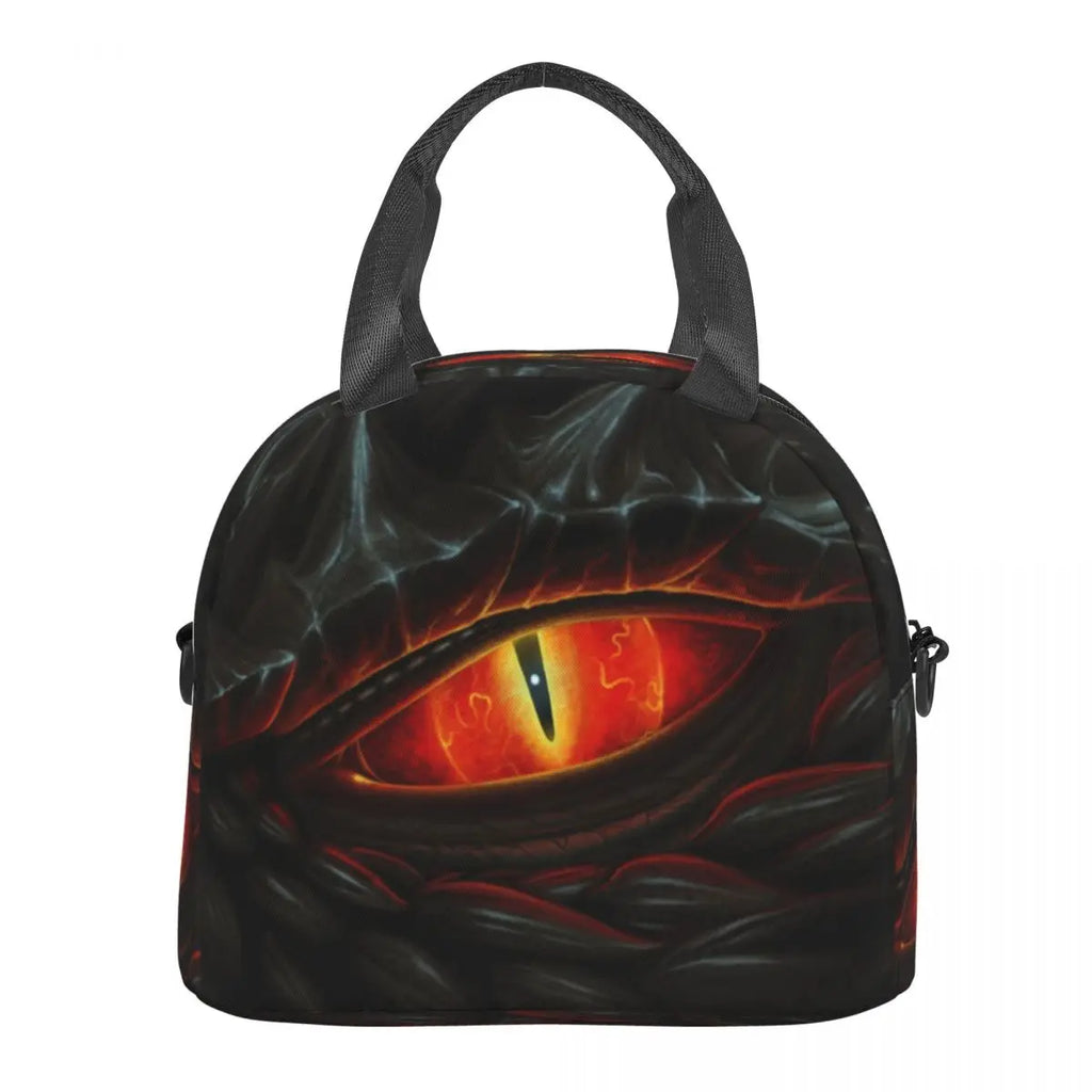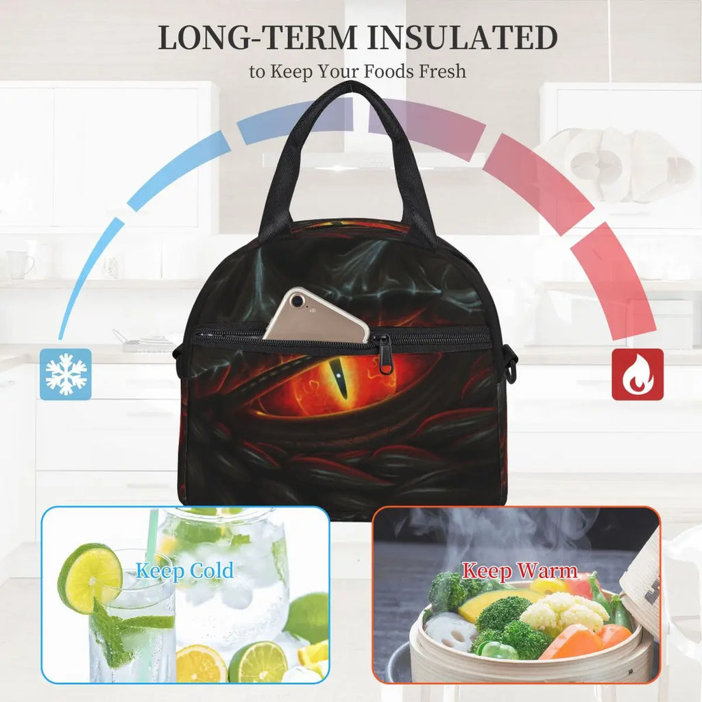 Stay stylish and organized with this thermal bento lunch box storage bag featuring a glowing red eye of a dragon painting. Perfect for picnics and lunches on the go.
