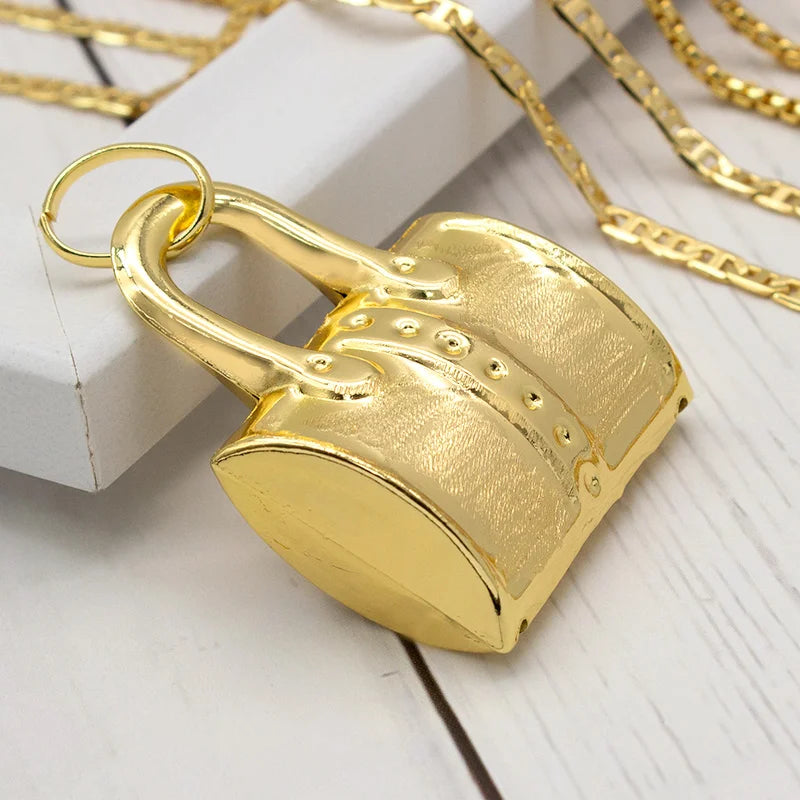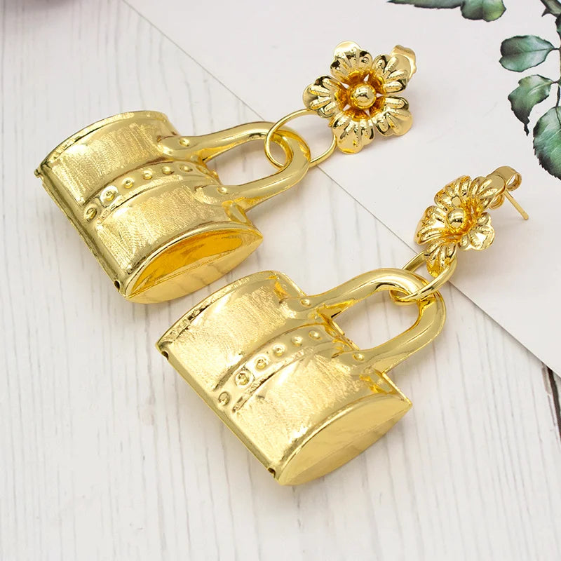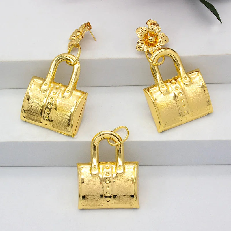 Stunning Dubai plated jewelry set with bag pattern drop earrings and necklace pendant, perfect for weddings or as a bride accessory. Includes a chain for added elegance.