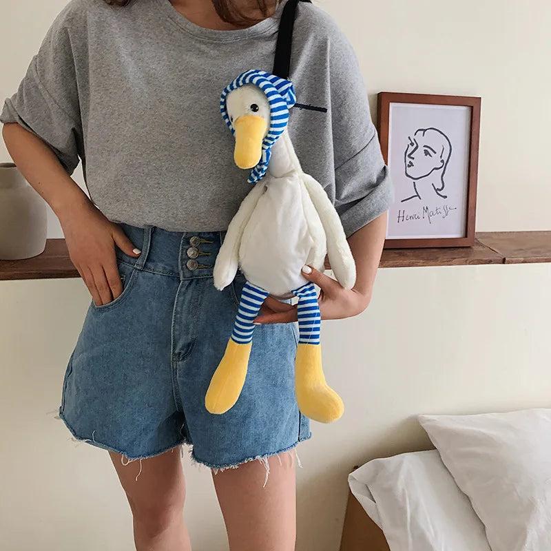 Adorable duck plush bag perfect for female students. Can be used as a toy bag or a fashionable accessory.